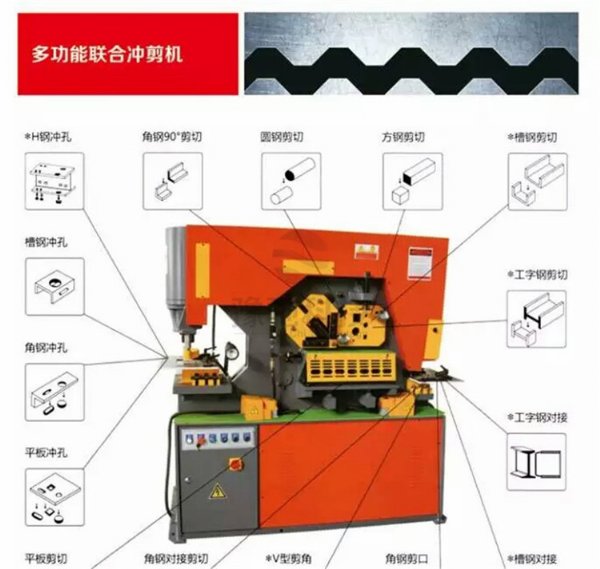 2.机器标准配备冲孔工位,槽钢及角钢剪切工位,厚板剪切工位,圆钢及方钢剪断工位,切角工位。可选购冲大孔,板材折弯,槽钢型钢冲孔,百叶窗及管材切角等附件。