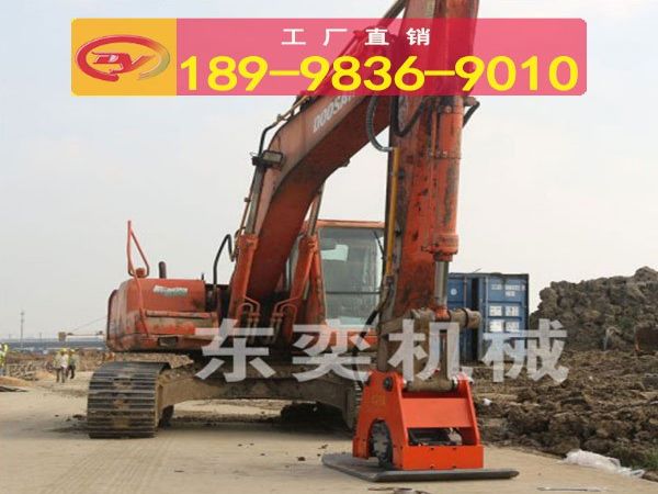 挖掘机振动夯的目的是提供一种斜坡段土石方夯实装置,解决低湖岸斜坡面不容易低成本快速夯实的技术问题。为实现上述目的,本实用新型采用如下技术方案一种斜坡段土石方夯实装置,包括平板夯实头,所述平板夯头由夯实板、加劲板和连杆,所述夯实板为矩形的厚钢板,夯实板的下面平整,上面正中有一个圆筒形的连接座,连接座的外壁周围放射状连有加劲板,连接座与连杆的一端连接,连杆的另一端与挖掘机的小动臂连接,挖掘机的小动臂与挖掘机的大动臂铰接,挖掘机的大动臂与挖掘机车体连接。所述加劲板为直角三角形,均匀等距分布在连接座的周围,一条直角边与连接座焊接,另一条直角边与夯实板焊接。与现有技术相比本实用新型具有以下特点和有益效果本实用新型克服了传统重型压路机械无法在斜坡面上作业以及人工作业成本投入巨大、夯实效果不理想的缺点,解决了保质高效完成斜坡面夯实的技术问题。本实用新型结构简单,制作方便,应用便捷,它安装在挖掘机上,通过挖掘机液压缸的往复运动带动夯实平板的交替夯击,来夯实土石方,夯实施工时从上到下进行震动夯击,相邻两个夯实面之间相互重叠,从而保证了湖岸斜坡面的土方压实施工质量。本实用新型一次性投入较少,节约了成本,适用性好,夯击过程安全可靠,与普通人工打夯相比,土方施工的夯实质量明显高于人工夯实质量,达到了人工夯实难以达到的夯实强度,保证了湖岸斜坡面的施工质量,且施工效率远远高于人工打夯机,大大的缩短了该工序的施工工期,为以后的工序施工赢取了大量的时间。本实用新型可广泛应用于人工湖、水利工程等斜坡土方工程。