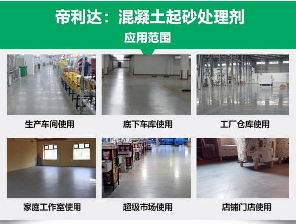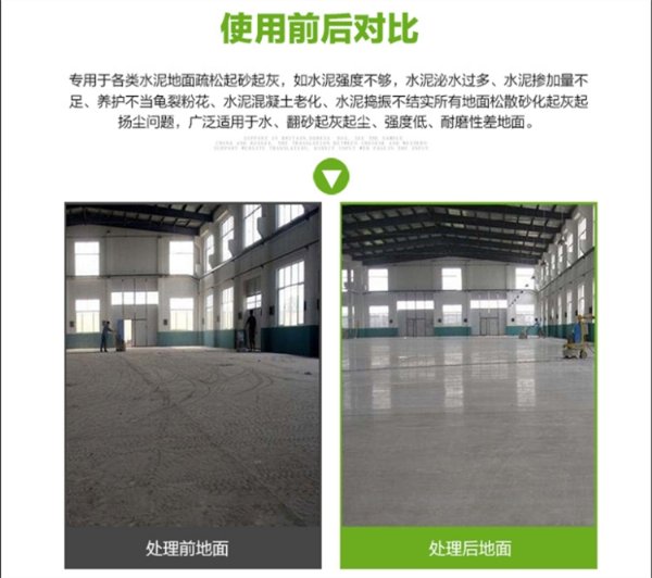 ※适用于因面层强度不够造成的起灰、起砂地面的硬化防尘处理,如:起灰、起砂的混凝土地(路)面、水泥砂浆地面,起灰的水磨石地面,起灰的金刚砂地面,起灰的水泥自流平地面。