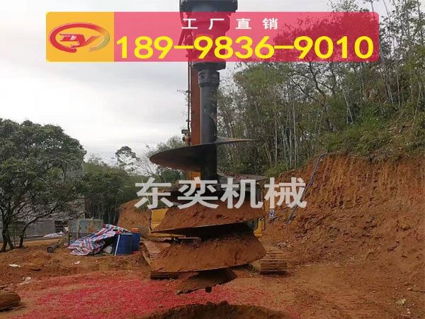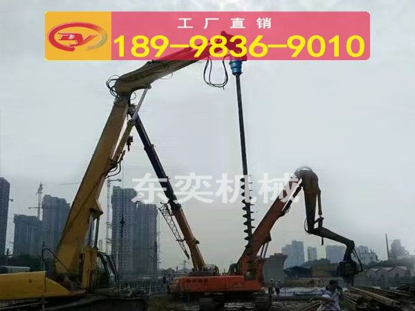 挖掘机螺旋钻机安装拆卸方便。挖掘机小臂不用拆卸,直接类似挂破碎锤一样,管路系统都可以共用,真正实现一机三用——挖、破、钻。拆卸时间和换斗时差不多。左右有摆动角度36°。当挖掘机在工地不平坦的情况下,挖机手可根据位置不同调整钻杆角度,保持90°垂直下钻,而挖改则不能调整,挖掘机是斜的就只能钻斜孔。 作业半径大。因为小臂不拆,它的作业半径至少可以比挖改延长作业半径2-3米,且平打孔、仰角打孔、竖打孔都可以实现。我们螺旋钻机可以根据不同配车进行改装,只要您提供对应的配车我们给到您合适的方案可以进行改装,产品内部给您做一个简单介绍,动力机头内部采用引进的是美国进口的马达提供足够动力,同时机头也是我们的核心产品,齿轮箱采用两层变速齿轮提供动力变速,确保齿轮正常运转,大大增加适用性,解决全球不同地方不同土质的施工现场,输出轴承采用非移位轴,确保桩孔精度和使用寿命.托架介绍:起移动托举的作用,在施工过程中避免不良操作震动带给机身损害,以上为螺旋钻机部分介绍,如果有疑问,欢迎来电咨询。螺旋钻机采用挖掘机,装载机,铲车,钩机作为动力适用于种树挖坑、电线杆坑钻孔、钻孔直径径范围为:200mm-1200mm。适用于直接钻孔立杆的工程,也适用于在坑中下卡盘的钻孔工程。该机同时适用太阳能光伏发电中支架安装时的钻孔工程,将钻杆卸下后安装特定连接头可直接用于螺旋桩的安装。同时该机也被称作为打桩机,在农村房屋改造工程中,该机可以用于桩基的钻孔。该机充分实现了一机多用的功能,大大提高了实用性。螺旋钻机,主要由驱动头和钻头组件构成,驱动头与钻头组件固定连接,钻头组件包括钻杆、包绕着钻杆的螺旋叶片、以及设置在钻杆末端的钻头,所述的螺旋叶片的底端设置有钻齿。