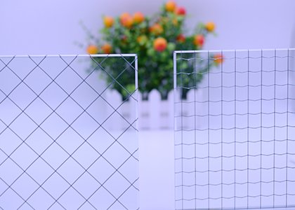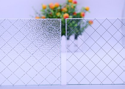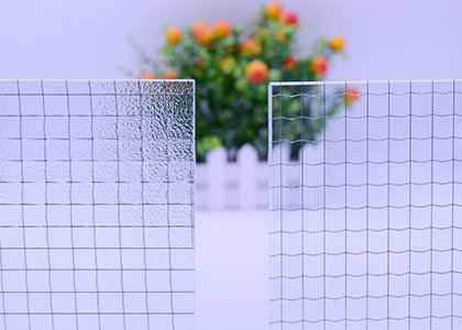 夹丝玻璃是采用压延工艺生产出来的一种安全玻璃。成卷的金属丝网由供网装置展开后送往熔融的玻璃液中,随着玻液一起通过上、下压延辊后制成夹丝玻璃。夹丝玻璃中的金属丝网网格形状一般为方形或者菱形格,而玻璃表面可以带花纹(及香梨),也可以是光面。夹丝玻璃厚度一般为6-16mm(不含中间丝的厚度),安全玻璃可在建筑物顶棚等场合使用。