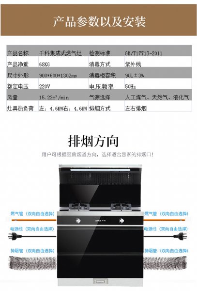 商品名称:千科(QIKE) JJZ-QK900-K1低空侧吸下排集成灶消毒柜一体套装自动清洗电机配件