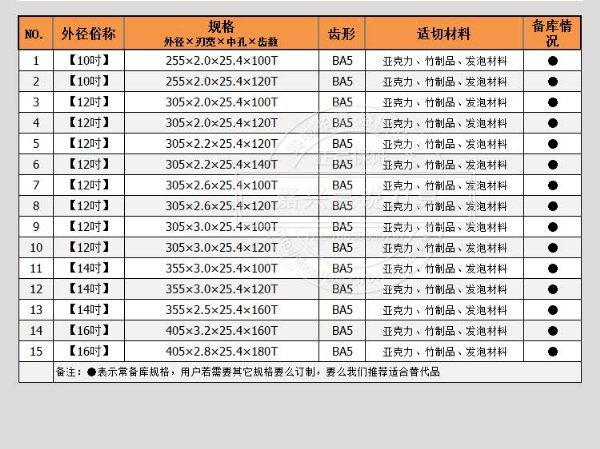 产品种类比较多,下面就简要介绍一下小林亚克力锯片系列产品,列出相对常用的锯片规格表,不同规格价格不一,一条信息无法做到多个报价,有需要的客官可至我司淘宝直营店选购(旺旺:coldsaw)