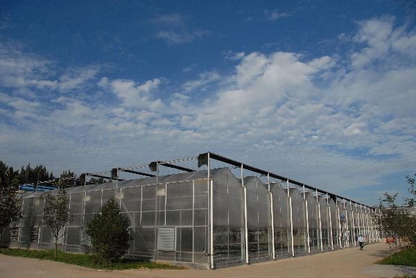 文洛型温室的立柱少、空间大,便于安排作物种植,屋面采用的小尖顶的形式,顶部空间小,能够减少夏季降温和冬季加温的能源消耗,且顶部采用“几”字钢的结构,能有效的减少温室结露对作物的影响。如采用覆盖材料为玻璃,温室透光率好,升温速度快,室内外通透明亮,美观大方,适合高档花卉种植、科研和参观;如覆盖材料为PC板,温室保温性能好,抗冲击性能很好,能抵抗冰雹的冲击,适用于中、高档花卉、蔬菜的种植、科研。