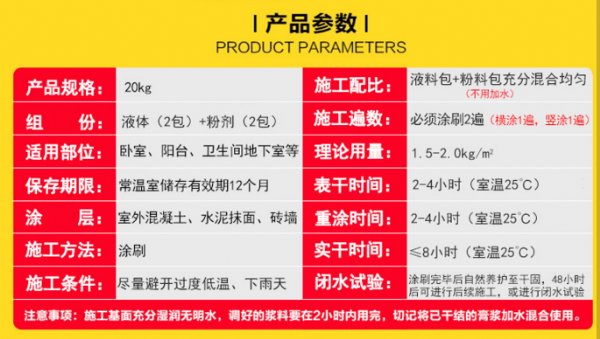 用量因基材和施工方法而异,每涂用量约为1.5-2.0kg/m2,两涂施工厚度应至少为1.5mm以上。
