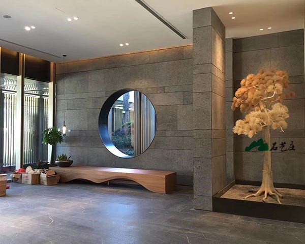 火山岩,并不常见的岩石种类,在全世界范围都有存在,但质地色彩各不相同,石艺庄火山岩文化石是采用海南黑火山岩加工制作而成,海南火山岩质地坚硬,强度达到7的硬度等级, 独特的孔洞表面,有一种与生俱来的复古感,也因此常被称为“洞石”“黑洞石”,再通过表面的造型加工,比如鎏金·火烤·荔枝面处理·拉丝面处理·亚光面·菠萝面处理后,视觉效果更是惊艳。像火山岩文化石经过防水处理可以放在厨房洗手间里,不仅美观而且防滑。