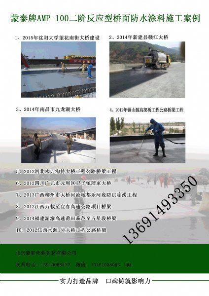 AMP-100二阶反应型桥面防水粘接剂采用特种国产沥青或进口石油沥青为主要原料,配以各种表面活性剂及多种化学助剂、SBS热塑性橡胶为辅助原料,在掺加大剂量的高分子聚合物树脂进行改性,生产的一种新型复合防水涂料。经交通部公路工程检测中心测试,AMP-100二阶反应型桥面防水粘接剂全部技术指标均符合JC/T975-2005标准要求;符合JC/T408-2005(公路桥涵施工技术规范),AMP-100二阶反应型桥面防水粘接剂能将基路(桥)和路(桥)面溶合为一体,形成一个高弹改进型塑性承重、防水和抗剪的整体,从而大幅提高道桥路性能,延长路桥尤其是陡坡弯道重载路面的使用寿命可达12年以上。