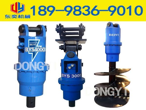 挖掘机螺旋钻机特点:1、质量稳定,采用进口液压马达,高精密度齿轮,二级减速齿轮箱,用得放心。2、分体式输出轴,合金钻齿。3、坚固耐用,不易变形的底材,防摆十字托架,将螺旋钻机牢牢地固定在挖机上,避免晃动。4、机动灵活,整机吨位小,移动方便,操作简单。5、可改变钻杆直径钻出不同大小直径的孔。