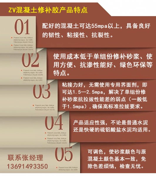 1. 配好的混凝土可达55mpa以上,具备良好的韧性、粘接性、抗裂性。