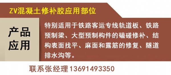 特别适用于铁路客运专线轨道板、铁路预制梁、大型预制构件的磕碰修补、结构表面找平、麻面和露筋的修复、隧道排水沟等。