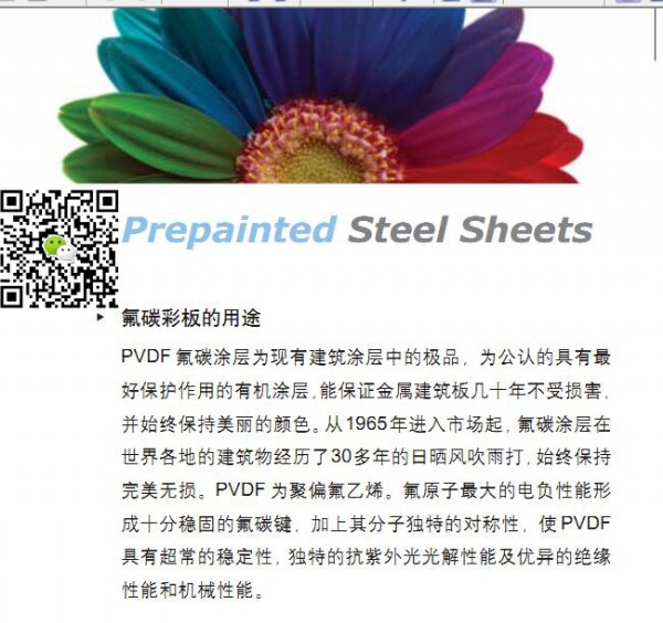 由于PVDF的化学键与化学键间,有很强的键能,因此涂料具有非常好的防蚀性和色泽保持性,在建筑工业用彩涂钢板涂料中,是属于*高级产品,且分子量大又为直键型结构,因此除耐化学药品性之外,机械性能、耐紫外线和耐热性能也很突出。在一般环境下,其防蚀年限可达20—25年之久。近年来,国内开始盛行以三氟氯乙烯和乙烯酯单体共聚的含氟树脂,大量应用于建筑的外墙和金属板,由于使用易水解的乙烯酯单体和氟的含量较PVDF低30%左右,因此其耐候性与PVDF比较,有一定的差距。宝钢所生产的氟碳涂层,其涂层PVDF含量不小于70%(其他为丙稀酸树脂)。