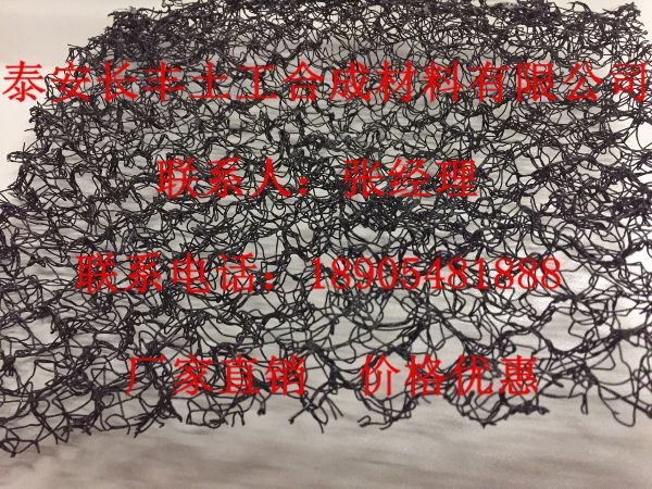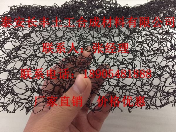 网厚度20mm;单位克重500g/m2,纤维直径0.56mm;适用温度-40℃~+80℃;阻燃级别B2;结构类型为开孔型;孔洞率≥95%;幅宽1000mm;抗拉强度20KN/m;设计合理使用年限20年;纤维长度1425m/m2。