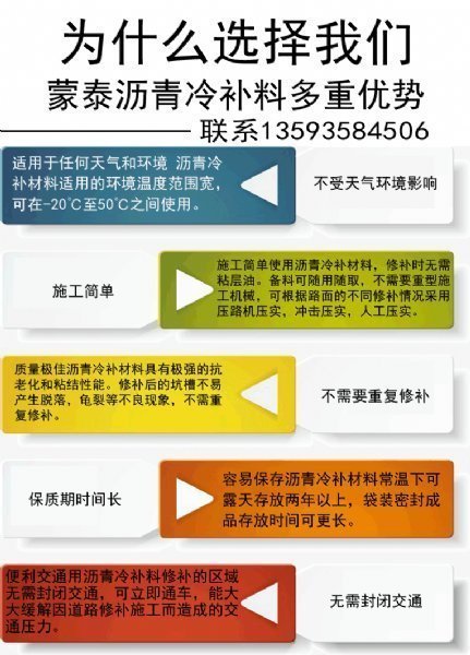 冷补适用的环境温度范围宽,可以在-30至50之间适用,冷补防水性能很好,在雨雪天气和积水坑穴都可以施工。