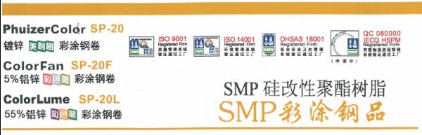PhuizerColor SP-20, ColorFan IP-2C:与Co丨orLume SP-20〖,系采用硅改性聚酯涂料 (Silicone Modified Polyester,简称SMP)为上涂层(Topcoat)之双面二涂二烤(2C2B):而底材可分 别选配热浸镀锌、镀5%铝锌与镀55%铝锌之彩涂钢品。即涂料系统相同,底材不同之特级彩涂钢品。具有优良的耐蚀性、耐候性及色彩保持性,同时拥有多样亮丽之色彩。