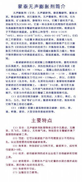 (1) 破碎剂不属于危险物品。 因而在购买、运输、保管、使用中,不受任何限 (2) 施工过程安全。 不存在爆破时产生的震动、空气冲击波、飞石、噪音、有毒气体和粉尘的危害。