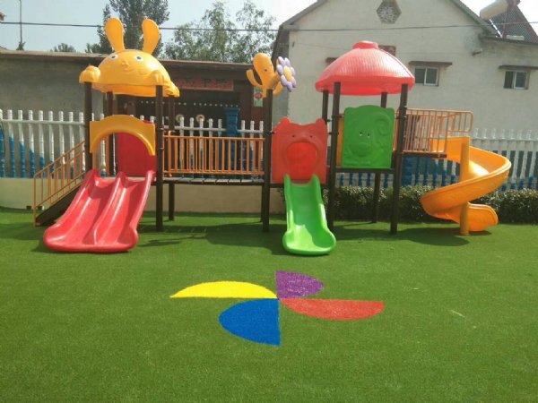 2、幼儿园人造草坪可在各种基础表面安装,基础质量要求不高,不怕开裂,无起泡脱层之忧,简单且经济。