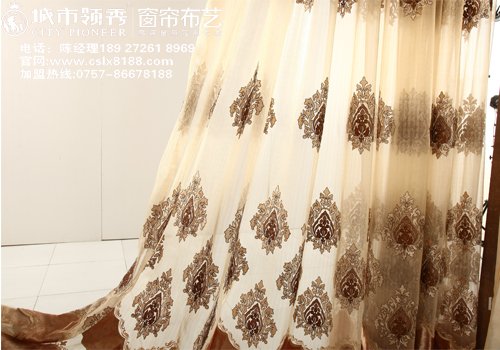 中国著名窗帘品牌城市领秀为你介绍的此款窗帘产品取名为“真丝贵族”,此款布艺窗帘方案采用暖色调的人造真丝进口面料,庄重、沉稳、尊贵、华丽尽先高贵气质,布料和帘头上高端贵气的大马士革贴绒绣花图案再加上珠帘花边装点窗帘,强调我们家居的氛围气度不凡。让整个空间呈现舒适而高雅的气息。