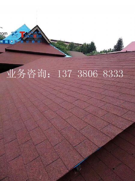 自粘胶预热自动激活,天信牌多彩玻纤瓦采用独特配方调制的自粘胶能使瓦与瓦、瓦与基层之间牢固的粘连在一起,形成一个坚实的整体,防水抗风性能突出。