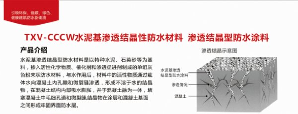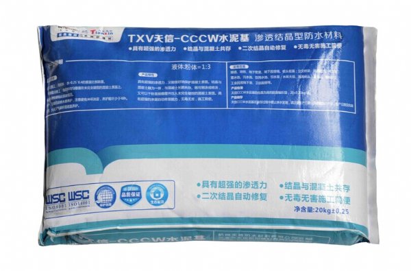 水泥基渗透结晶型防水材料是以特种水泥、石英砂等为基料,掺入活性化学物质、催化剂和渗透促进剂制成的单组灰色粉末状防水材料,与水作用后,材料中的活性物质通过载体水向混凝土内孔隙和微裂缝渗透,形成不溶于水的结晶物,在混凝凝土结构内部吸水膨胀,并于混凝土融为一体,堵塞混凝土中的毛细孔道和微裂缝,结晶物在涂层和混凝土基面之间形成牢固界面防水层。