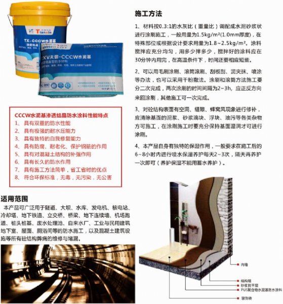 应用范围主要应用于地铁车站、地下连续墙、隧道、涵洞、水库大坝,工业与民用地下室、屋面、厕、浴间等混凝土结构表面的防水施工,结构开裂、渗水点、孔洞的堵漏施工、以及混建筑设施的弊病维修。