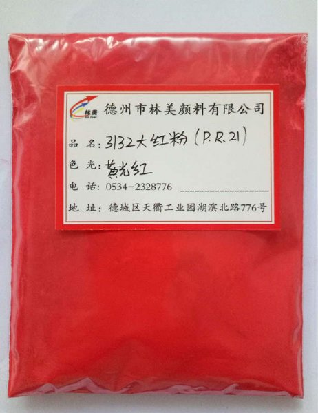德州市林美颜料有限公司18553493870供应3132大红粉,别名:永固红FR、21号红、有机颜料红21号等。国际索引号:C.I. Pigment Red 21(P.R.21),单偶氮。 【物化和牢度性能】: PH值:6.0-6.5,耐光性 4-5 ,耐热性:180℃,吸油量(ml/100g):35-45, 耐水性:3,耐油性:3 耐酸性:5 ,耐碱性:5 ,【色光及应用领域】:黄光红,色光鲜艳。着色力强,耐晒性和耐热性良好,耐碱性较差。主要用于水性油墨、胶印墨,涂料色浆、橡胶、涂料、皮革、塑料、油漆、美术颜料。