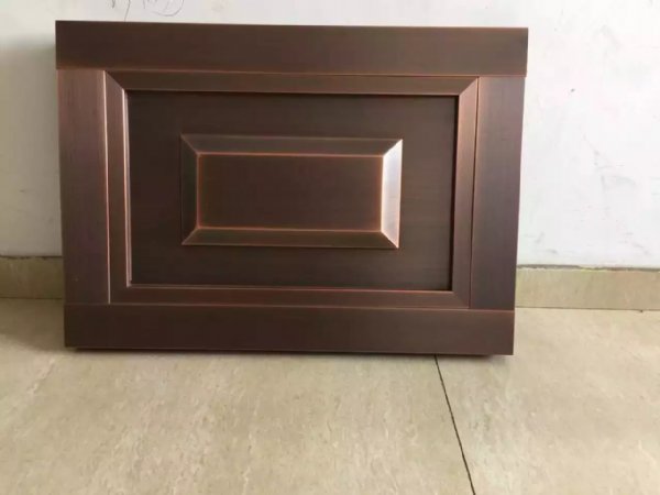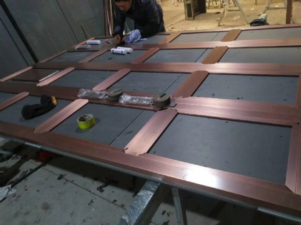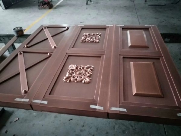 外表为铜板,双面铜板厚度约0.6MM,内部保温板或者镀锌方管架结构,总厚度约6CM,表面经复古特殊工艺处理特点:外观古朴,坚固耐用,强度大,抗弯曲,无缝隙,防风,防雨,防尘,具有普通车库门的功能和优点。