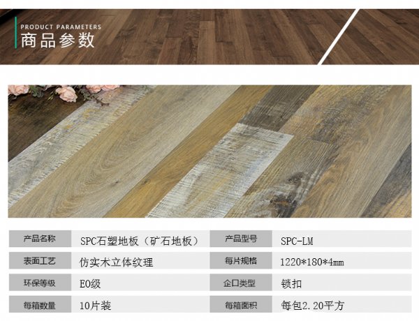 SPC 地板主要由钙粉、聚氯乙烯树脂,稳定剂组合的一定比例挤塑而成的地铺材料。是响应国家减排而发明的新型..