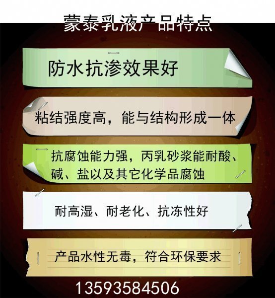 构成组分:多种丙烯酸、甲基丙烯酸、甲基丙烯酸甲酯,丙烯酸酯类以及功能性助剂多元聚,通过优化工艺共聚而成的乳液。