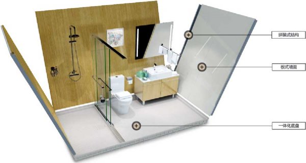 顶板构成的整体框架,配上各种功能洁具形成的独立卫生单元。具有淋浴、盆浴、洗漱、坐便四大功能或这