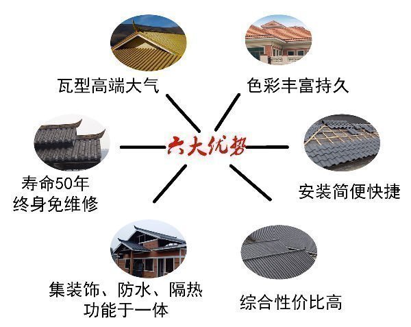 适应性强,各种建筑屋顶均可方便安装,屋面坡度从20°到80°,特别适用于圆、锥、尖等形状的多面屋顶。钢结构、木结构屋顶可直接用螺钉固定琉璃瓦,混凝土屋顶不用做防水处理,省去防水材料、保护层和找平层,节省材料和人工成本。且重量轻,每平方不到20公斤,大大降低了屋面的自重,铺装的速度快,减少工期。整个屋面工程综合成本低,管用50年以上。