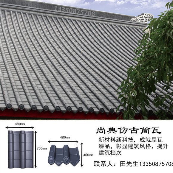 复合聚脂材料的琉璃瓦,采用新材料新工艺,达到古建瓦的装饰效果,增强防水性能,提高使用寿命,是现代建筑的优良屋面瓦产品。