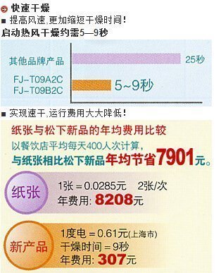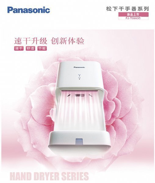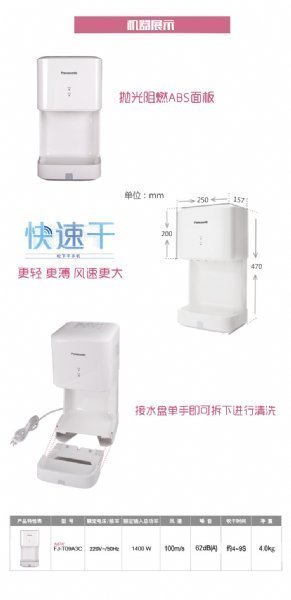 松下干手器----采用著名的松下电机,人性化的设计风格,独特的接水盘设计,防止地面湿滑.外观大方典雅,是居家、酒店、商场、会所、娱乐、餐饮等场所*产品! 松下干手器FJ-T09A3C Panasonic超强风力,干手迅速。 松下干手机适合任何场所使用:写字楼,购物中心,酒店,居家。 强劲风速约100米/秒,配合温风功能能把手上的水份在短短5~9秒内吹干 Panasonic干手机独特设计的高速马达,风速达每秒100米,配合温风功能。能把手上的水份在短短5~9秒内吹走。此外,接水盘能加强气流的循环,缩短吸入空气的加热时间,从而提高喷嘴处气流的加热效率。 独特接水盘设计,防止地面湿滑 附设的可卸式接水盘,能大大减少洗手间地面湿滑的情况,减少不必要的意外发生。接水盘更设有水满指示,清洁简便快捷。 外型美观,功能特多 红外线自动感应:使用者无需接触任何按钮,操作简便快捷。
