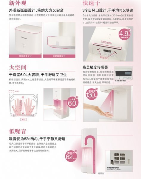 松下干手器主要运用于宾馆酒店、科研机构、医院学校、车站机场、酒吧KTV等公共及娱乐场所。 当洗完手后,将双手伸入松下干手器的出风口下,松下干手机会自动送出舒适的冷风或者暖风,迅速使您的双手去湿变干,当手离开松下干手器风口时它会自动停风关机。因其可迅速干手,无需擦手纸,节能环保,已成功被KFC 麦当劳等国际连锁企业采纳。