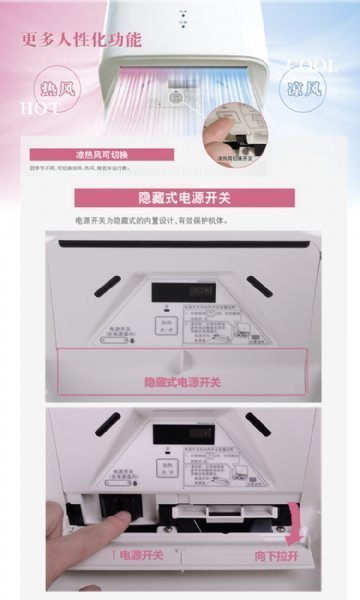 高速气流喷射,风速强劲,干手快速。ABS树脂材料外壳,安全系数高,红外线自动感应,数码电路控制,..