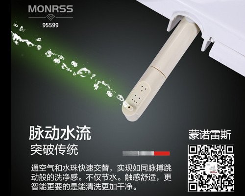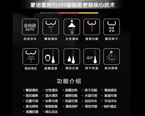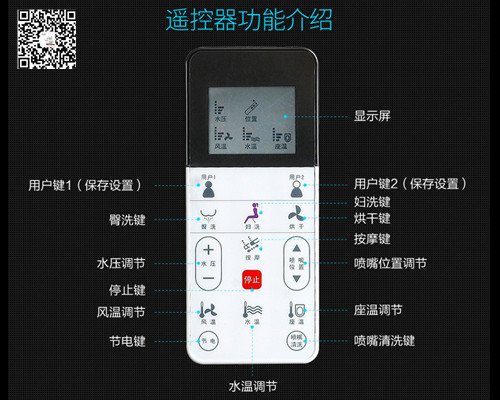 臀洗,妇洗,气泡清洗,移动按摩,独立通便;水温,座温,暖风四档调节;双重过滤,水压调节,三重安全保护,落..