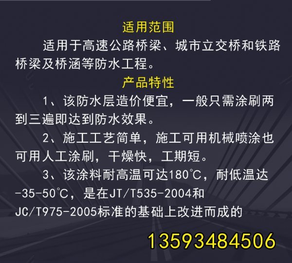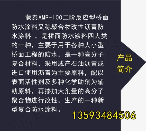 AMP-100二阶反应型桥面防水粘接剂采用特种国产沥青或进口石油沥青为主要原料,配以各种表面活性剂及多种化学助剂、SBS热塑性橡胶为辅助原料,在掺加大剂量的高分子聚合物树脂进行改性,生产的一种新型复合防水涂料。经交通部公路工程检测中心测试,AMP-100二阶反应型桥面防水粘接剂全部技术指标均符合JC/T975-2005标准要求;符合JC/T408-2005(公路桥涵施工技术规范),AMP-100二阶反应型桥面防水粘接剂能将基路(桥)和路(桥)面溶合为一体,形成一个高弹改进型塑性承重、防水和抗剪的整体,从而大幅提高道桥路性能,延长路桥尤其是陡坡弯道重载路面的使用寿命可达12年以上。