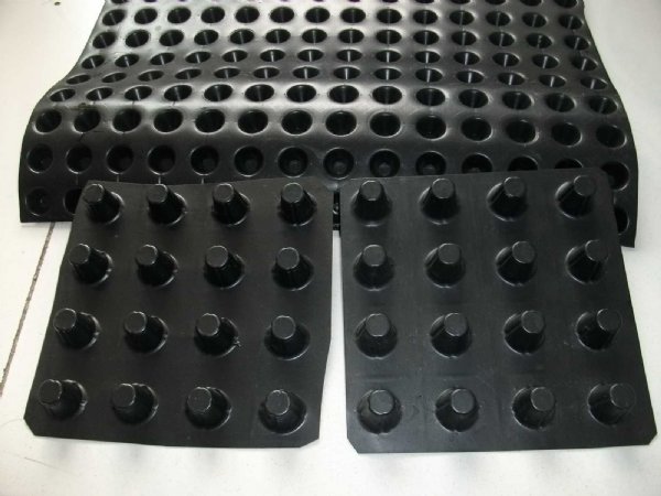 塑料排水板是由聚苯乙烯(HIPS)或者是聚乙烯(hdpe)为原料塑胶底板经过冲压制成圆锥突台或者加劲肋的凸点(或中空圆柱形多孔)而成,经过不断的创新研发原料得到巨大提升和变更,现由聚氯乙烯(PVC)为原料压制而成,抗压强度和整体平整度得到大幅度的提升,幅宽有1~3米,长度有4~10米或者以上。圆锥突台的顶面胶接一层过滤土工布,以阻止泥土微粒通过,从而避免排水通道阻塞使孔道排水顺畅。传统的排水方式使用砖石瓦块作为导滤层、使用较多的鹅卵石良好的排水系统对土建的施工周期及构筑物的正常使用和寿命具有重要的