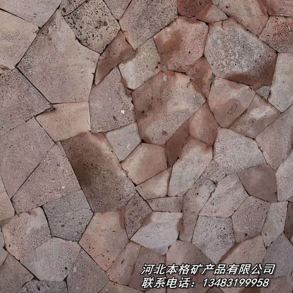火山岩是熔融的岩浆随火山喷发冷凝而成的密集气孔的玻璃质熔岩,其气孔体积占岩石体积的50%以上。因孔隙多、质量轻、容重小于1克/立方厘米,能浮于水面而得名。它的特点是质量轻、强度高、保温、隔热、吸音、防火、耐酸碱、耐腐蚀,且无污染、无放射性等,是理想的天然绿色、环保节能的建材原料。本区的浮石矿质量较好,颜色多为灰黑色和褐红色,矿石基本呈较均匀的气孔状分布,矿石结构为玻璃质结构,构造为气孔状构造。因其表面均匀布满气孔,色泽古色古香,同时具有保温、隔热、隔音、吸音和导电系数小、无放射性等特性。机切规格厚度(15-30)mm
