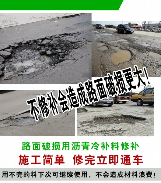 3,修补质量佳冷补料具有极强的抗老化和粘结性能,修补后的坑穴,不易产生脱落,龟裂等不良现象,不需重复修补。
