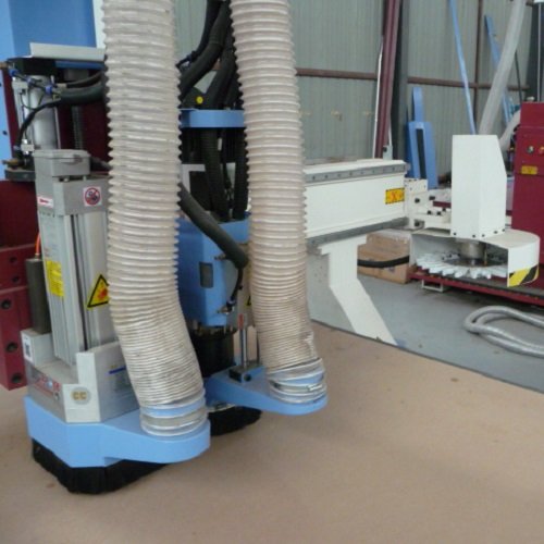 无孔工艺数控开料机,采用专用锯片主轴,稳定性好。 12把直排换刀,节省换刀时间,效率高。 真空吸附台面,..