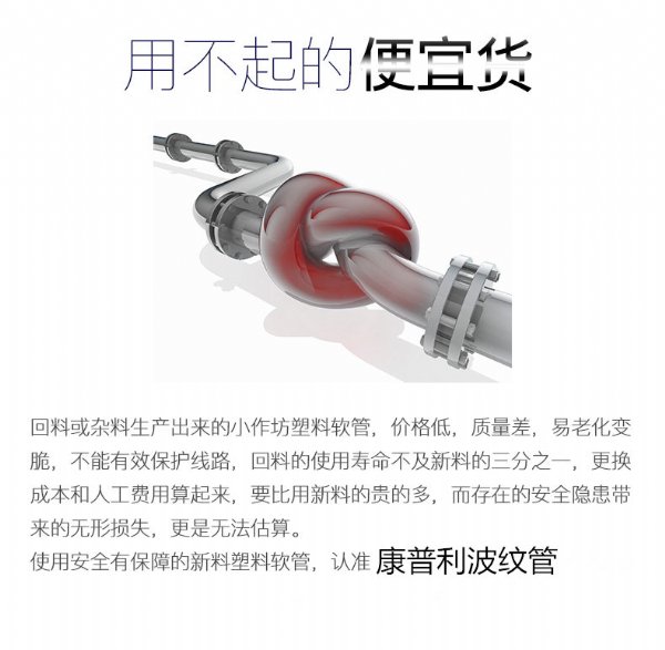 康普利节能环保设备泰州有限公司的主要的产品有塑料波纹管(PA PP PE),可挠电气导管(KZ-1 KV-1 KV-2 KV-3 KNG ),包塑金属软管(JS JSH JSB JSHG等),烟气检测采样管,不锈钢金属软管等各种电线电缆保护套管,并配套供应规格齐全的金属、尼龙接头。公司的产品被广泛应用到了新能源汽车(汽车制造)、通讯设备、轨道交通、新能源设备、工程机械、自动化仪器仪表、电梯、电机马达、机械制造、电气绝缘保护、照明设备、航空设备,地铁,火车、自动化控制等各行各业,产品远销全国各个地区。