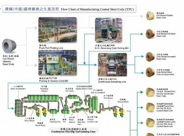 烨辉(中国)公司建厂初期土地面积约350亩,在2002年11月18日奠基,*一期建厂工程包含酸洗线、冷轧机、热浸镀锌线及彩涂线各一套,已在2005年3月前陆续投产。而第二期扩建增设冷轧机、热浸镀锌线及彩涂线各一套,亦已在2005年12月前陆续投产。第三期扩建工程,包含第三套热浸镀锌线一套已于2009年第二季投产。故2009年产能,热浸镀锌钢卷为90万吨、彩涂钢卷为36万吨,应可满足客户之强烈要求。