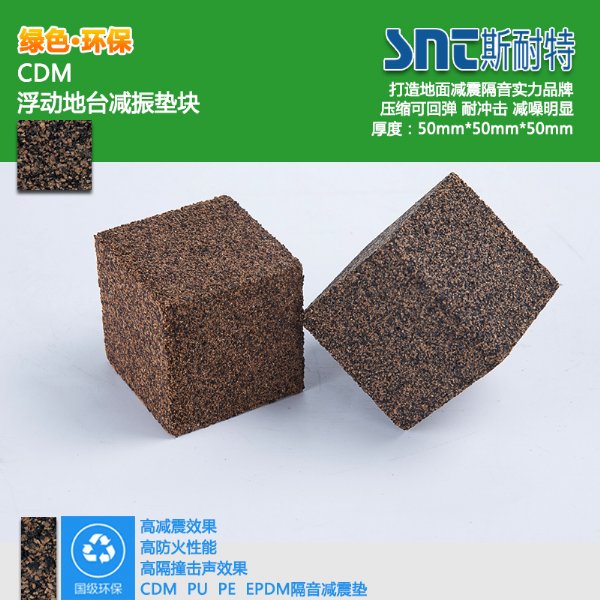 橡胶和软木颗粒、高分子粘合剂及其他化工原料组合并通过高温高压模压而成型。该材料是一种纯天然环保材料。具有良好的回弹特性以及非常久的使用寿命,抗老化,用于浮动地台基础中,使隔振系统具有极高隔振降噪性能,有效地隔绝上下楼层间的空气传声和撞击声。
