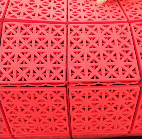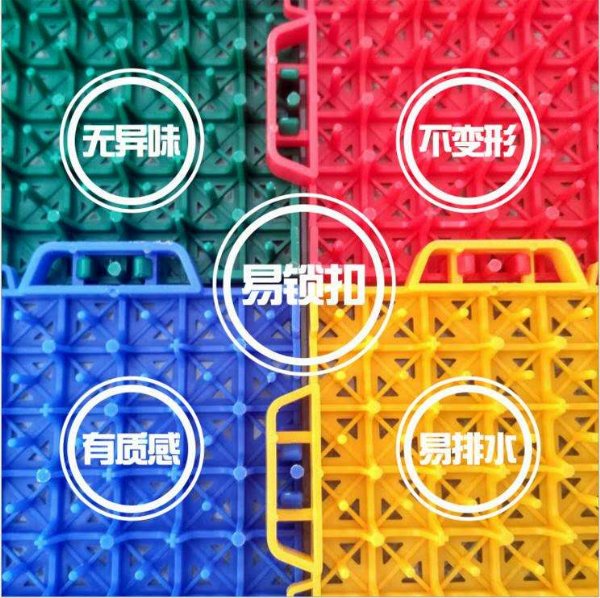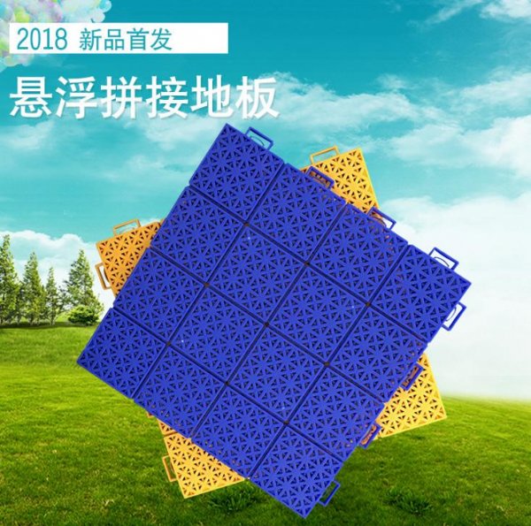 悬浮拼装地板采用高强度pp环保材料,同时采用德国进口巴斯夫抗氧化剂、抗紫外线剂、抗老化剂以及进口色母粒,解决了热胀冷缩的问题,具有耐压、耐冲击、耐高低温,耐候性高、防滑防污、防水耐潮的特点;悬浮式设计加上底部支撑脚的设计起到了垂直减震、能量回传、提供侧向缓冲力的效果,防滑耐磨,防治运动损伤,是幼儿园,篮球场体育场*地板,而且颜色鲜艳多样,弹性好,使用寿命长,只需平整的水泥或沥青地面基础即可铺设;适用于幼儿园,室内室外篮球场,足球场等运动场所,老年活动中心,娱乐休闲场所等!