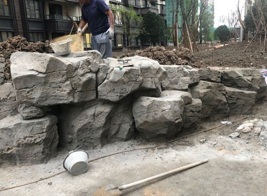 水泥塑石位于小区的河道驳岸和道路两侧,起到护栏和河道景观的作用,总长约140米、高度1.2米左右、总施工量约600平方米,我公司共派遣12人的施工队伍进驻施工现场,力求在25天内完成施工任务, 现已完成了水泥塑石的焊接和绑网,正在进行塑石的砂浆抹面,目前主要的施工任务是砂浆纹理雕刻、上色,纹理已经获得了设计师和业主方的认可。