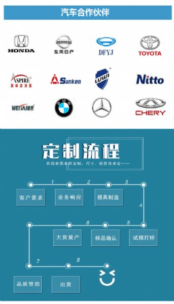 汽车配件系列主要制作汽车缸盖垫、冷却系统的橡胶密封垫、汽车减震系统用的各种橡胶减震套、隔音系列橡胶制品、转向系统用的密封件及减震套等。