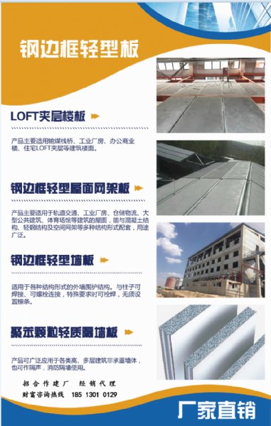 钢边框轻型板是一种轻钢轻混凝土新型复合板材,是由镀锌钢边框、方钢副肋、冷拔低钢丝网构成钢骨架;由发泡水泥、纤维、膨胀珍珠岩构成复合芯材;由玻璃纤维网格布、聚合物、抗裂砂浆组成面层等综合优化配比组合而成。