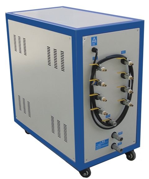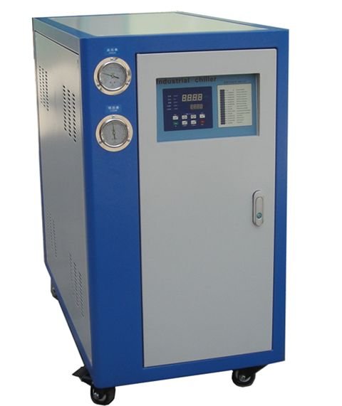 风冷式冷水机机身内含有保温水箱和水泵,散热方式是通过风扇来驱散的.需保持厂房内空气流畅,这样能增强制冷功..