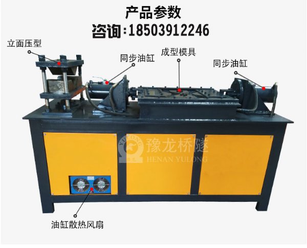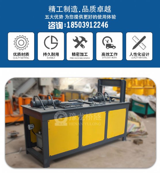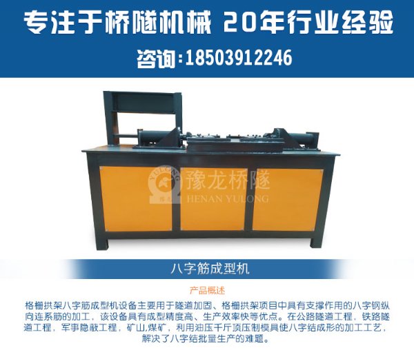 河南豫龙工程机械设备有限公司自主研制了全新的制作格栅拱架八字结的液压设备。利用这套新设备加工的格栅拱架新工艺克服了全线制作格栅拱架的通病,有效解决了两八字结之间内凹处的因接触面积不够而造成的受力降低,成功解决了八字结与主筋连接处的接触长度,*重要的是将焊接节点数降至*低,既省工、省料,又易于操作、掌握,极大限度地降低了成本。