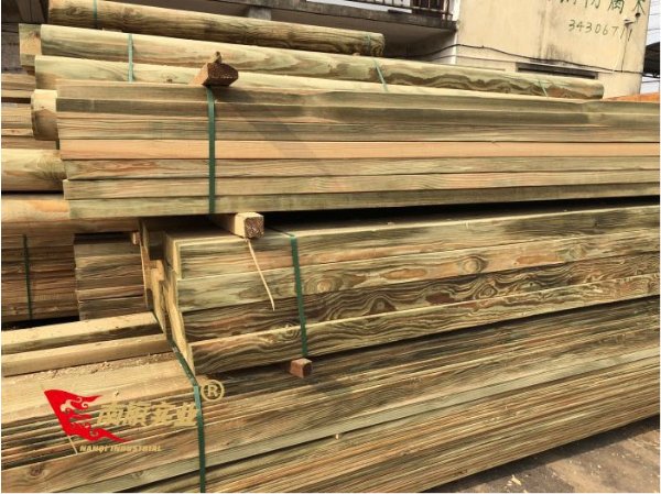 1、木材原木色较黄,在经药剂浸渍后外观颜色呈现出墨绿色,此类颜色更为的符合于园林景观建设的视觉要求